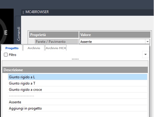 Ricorrendo al menù a tendina in corrispondenza della voce del giunto e quindi all’opzione Aggiungi in progetto si accederà all’archivio Giunti Acustici; ricordiamo che quest’ultimo non è personalizzabile ovvero al suo interno sono previsti tutti