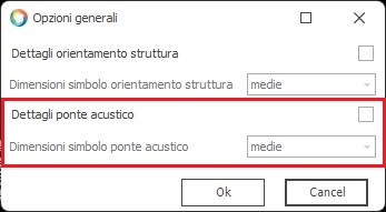 ponendo il segno di spunta nel checkbox Dettagli ponte acustico, verrà modificata la rappresentazione grafica del giunto; contestualmente si potrà scegliere la dimensione di visualizzazione nel campo sottostante Dimensioni simbolo ponte acustico secondo le tre opzioni piccole (opzione di default), medie, grandi.