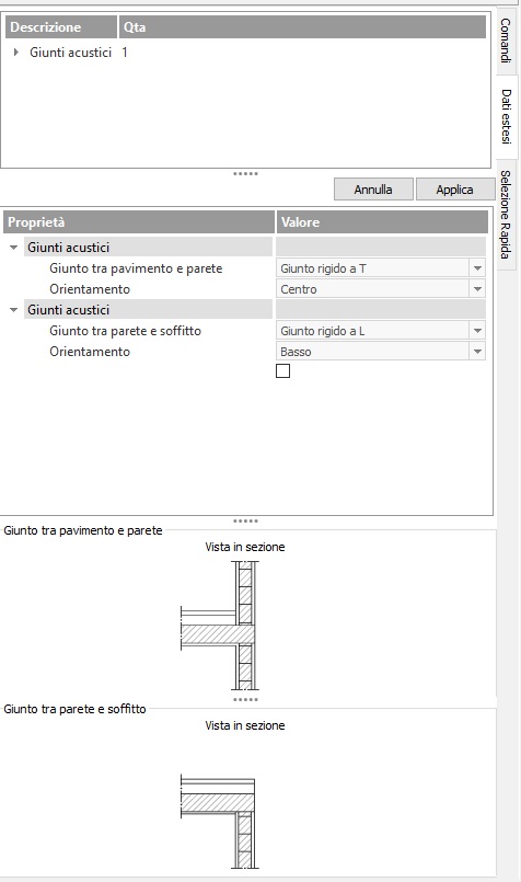 l’inserimento avverrà richiamando il comando Tale comando indurrà la comparsa, all’interno della barra laterale Comandi, delle caratteristiche dei giunti; al loro interno si potrà specificare sia il giunto da applicare tra parete e pavimento sia quello da applicare tra parete e soffitto.