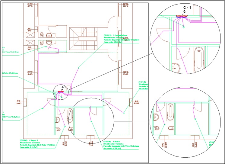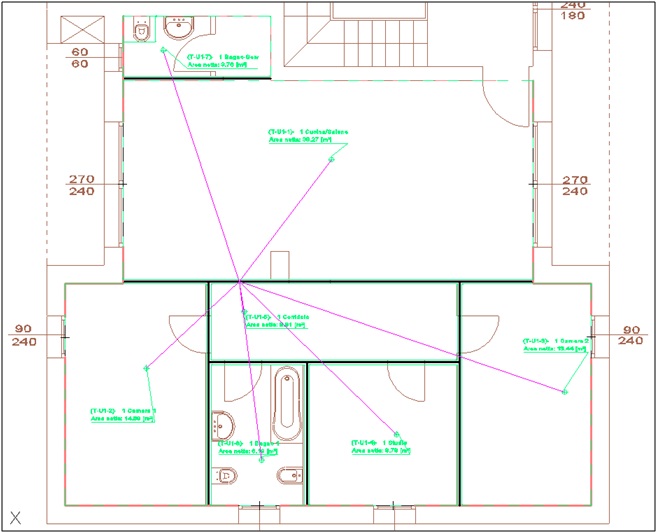 alloggio. Si noti che la linea magenta che rappresenta l'associazione ray area-collettore parte dal collettore ed arriva al tag della ray area. Pertanto, qualora un ambiente fosse servito da due collettori perché di grande dimensione, occorre che l'utente disegni più ray area ed associ ognuna di esse al collettore di competenza. Simulando il percorso delle tubazioni di adduzione all'ambiente il programma rileva in prima fase anche la lunghezza delle stesse e quindi computare il numero di circuiti in modo più corretto sin dalle prime impostazioni, fermo restando che al momento di disegno vero e proprio dei circuiti il calcolo sul loro numero viene rieseguito sulla base del disegno CAD che ovviamente tiene conto anche delle adduzioni (sempre che siano disegnate).