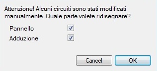 Disegno Circuiti Una volta eseguito il comando occorre cliccare su un tratto qualsiasi della linea di adduzione (colore ciano) ed il programma procede al disegno dell'intero circuito (dall'inizio della linea di adduzione sino all'ambiente). Qualora il disegno non fosse eseguito occorre controllare che il verso di disegno (impostazione ray area) sia compatibile con il percorso. Occorre soprattutto controllare la posizione dell'ultimo tratto entrante nella ray area (posizione rispetto i lati della ray area stessa). Inoltre controllare la presenza del TAG della ray area che non mostri ray area non chiusa. Qualora si sia usato il solo comando Live Circuits e non sia stata disegnata alcuna adduzione, per ridisegnare, occorre cliccare sulla piccola linea di colore ciano che il comando Live Circuits inserisce in prossimità del punto di ingresso dei circuiti nella ray area. Se i circuiti sono stati modificati il ridisegno avviene previo messaggio d'avviso attraverso il quale l'utente può ridisegnare tutto il circuito (adduzione + parte interna alla ray area) oppure soltanto l'adduzione o soltanto la parte interna alla ray area (vedi immagine sottostante).