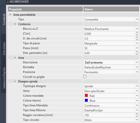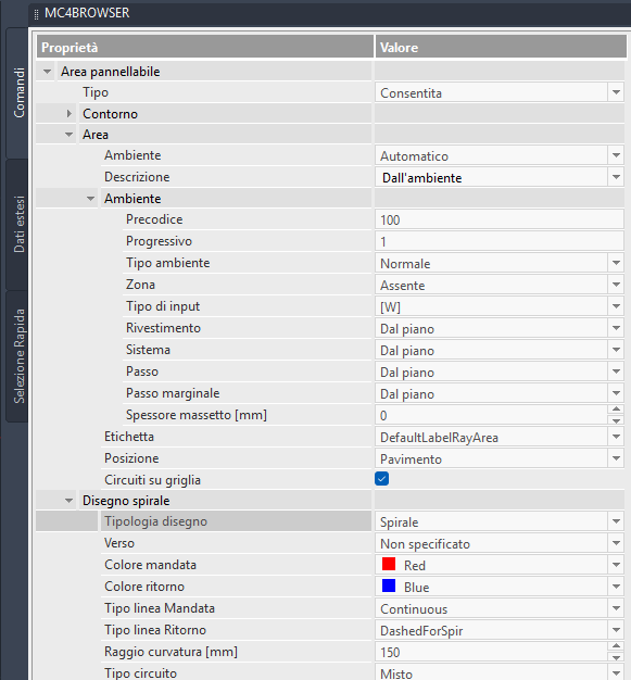 - Descrizione: la descrizione della ray area potrebbe anche essere diversa da quella dell'ambiente cui fa riferimento. Si consiglia di mantenere l'impostazione di default altrimenti è difficile mettere in relazione i dati della ray area e quelli dell'ambiente di riferimento. - Etichetta: definisce i dati da mostrare nell'etichetta della ray area - Posizione: importante selezione perché definisce la reale posizione della ray area indipendentemente dalle coordinate di disegno. Le opzioni sono: 1) Pavimento 2) Parete e 3) Soffitto. A parete e soffitto si può usare anche il tipo prefabbricato mentre sul pavimento no. inoltre pur inserendo come tipologia "Annegato" il programma corregge la resa dell'impianto in funzione della posizione a soffitto o a parete. Disegno Spirale: contiene i dati che definiscono il layout dei circuiti (usati per il disegno automatico dei circuiti) - Tipologia: selezionare il tipo di layout tra le opzioni disponibili: Spirale, Serpentina, Serpentina Serie e Doppio Meandro. Se tale opzione non è disponibile è perché il tipo di sistema scelto ha un solo tipo di layout che è stato impostato direttamente nell'archivio dei sistemi radiante come proprietà del sistema in questione. - Verso: selezionare se Orario o Antiorario - Colore Mandata/Ritorno: imposta il colore delle tubazioni di mandata e ritorno quando il layout è Spirale - Tipo Linea Mandata/Ritorno: Imposta il tipo di linea delle tubazioni di mandata e ritorno quando il layout è Spirale - Raggio di Curvatura: imposta il raggio di raccordo delle tubazioni del circuito. Influisce sul disegno del tratto centrale della spirale in modo importante - Tipo Circuito: le opzioni sono: 1) Misto 2) Soggiornale e 3) Marginale. In caso 1) il programma si predispone ad utilizzare due passi distinti tra zona soggiornale e zona marginale qualora le esigenze lo richiedano e nel momento in cui ci sono aree marginali. In caso 2) invece il programma, indipendentemente dalla presenza o meno di tratti marginali, considera l'intera area come soggiornale (temperatura pavimento limite = 29°C). In caso 3) invece l'area sarà solo marginale quindi con limite della temperatura del pavimento posto a 35°C indipendentemente dalla presenza di tratti soggiornali.