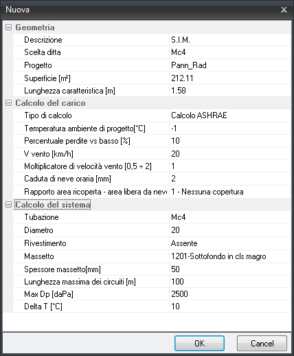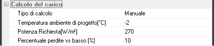 Geometria: Riporta i dati di superficie dell'area da coprire e la descrizione del progetto: - Descrizione: descrizione che identifica una determinata area - Scelta Ditta: selezionare il produttore del sistema (tubo, collettore, etc.) tra quelle disponibili o crearne una nuova - Progetto: selezionare il progetto di tipo tubazioni che si è dovuto creare nel file. - Superficie: è la superficie dell'area SIM all'interno della quale si è cliccato - Lunghezza Caratteristica: secondo la definizione ASHRAE (Standard usato per il calcolo) tale valore dovrebbe essere la larghezza dell'area misurata in direzione del vento (da un'idea di quanto sia esposta l'area) Calcolo del Carico: i dati qui inseriti sono utilizzati per determinare il carico termico per unità di superficie che il sistema radiante deve produrre (Calcolo secondo ASHRAE 2007 Handbook - HVAC Application) - Tipo di calcolo: i metodi di definizione del carico termico. Le opzioni sono tre: 1) Calcolo ASHRAE, 2) Tabella ASHRAE e 3) Manuale. Questa sezione della maschera si modifica in funzione di tale scelta. - Temperatura Ambiente di Progetto: il valore qui inserito è definito come "Temperature at Snowfall" ossia la temperatura dell'aria nel momento in cui nevica. Tale valore non sempre è zero perchè si potrebbe avere anche neve ghiacciata (nevica con temperatura decisamente più bassa). Comunque tale valore influisce sulla potenza finale dell'impianto: più è basso e maggiore sarà la potenza richiesta (Watt/mq). - Percentuale Perdite Vs il basso [%]: tale valore dipende dall'installazione. Se è prevista installazione dell'isolante al di sotto delle tubazioni e al perimetro (fascia di isolante) tale valore può essere posto a zero. In caso di mancanza totale di isolamento il valore può andare anche fino al 50% nel caso di terreni umidi. - V Vento [km/h]: velocità del vento in prossimità della superficie; - Moltiplicatore di velocità: incrementa la velocità del vento. Solitamente la velocità del vento è misurata non a livello terreno ma ad una certa altezza. Il moltiplicatore incrementa la velocità del vento alla quale deve essere eseguito il calcolo. Tale valore non influenza il calcolo se Ar (snow-free area ratio) è zero - Caduta di neve oraria [mm/h]: il valore si riferisce ai mm equivalenti di acqua - Rapporto Area Ricoperta - Area libera da neve (Snowfree Area Ratio) Ar: è definita come rapporto tra l'area "snow-free" equivalente e area totale. Il valore pertanto è compreso tra 0 e 1. Quando il valore è 1 significa che il sistema deve sciogliere rapidamente la neve in modo che non ci sia mai accumulo sul terreno. Quando il valore è 0 invece vuole dire che c'è neve (non ghiaccio) e non c'è alcun trasferimento di calore o di massa. Calcolo del Sistema: contiene i parametri per il dimensionamento del sistema - Tubazione: selezionare il produttore della tubazione che sarà installata nel terreno - Diametro: dimensione del tubo funzione del produttore - Rivestimento: tutto quanto è installato al di sopra del massetto (definisce una resistenza termica aggiuntiva) - Massetto: specificare il materiale il cui verranno inserite le tubazioni (terreno, calcestruzzo, etc..) - Spessore massetto: Spessore del materiale sopra le tubazioni - Lunghezza massima dei circuiti: determina il numero di circuiti una volta che è stato stabilito il passo che a sua volta dipende dal carico e dalla temperatura di mandata di progetto - Max Dp [DaPa]: Perdita massima ammissibile per il circuito più sfavorito. Determina la lunghezza dei circuiti la cui perdita di pressione è funzione della portata - Delta T [°C]: salto di temperatura tra mandata e ritorno nei circuiti. Nel caso in cui si selezioni Manuale come Tipo di Calcolo, la relativa sezione cambia come mostrata nell'immagine qui sotto.