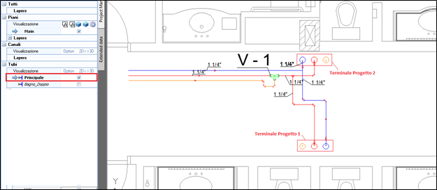 di due terminali progetto in corrispondenza di due bagni doppi.