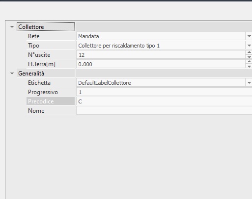 barra laterale i seguenti parametri: Tipo: Selezionare il collettore che si vuole inserire dalla lista che appare nel menu a tendina che si trova in corrispondenza di questo campo. La lista mostra tuti i collettori che si trovano nella scheda Progetto dell'Archivio Collettori. L'opzione Aggiungi in Progetto disponibile in questa lista vi permette di accedere direttamente alla maschera di gestione dell'archivio in modo da operare controlli o selezionare nuovi componenti dall'archivio stesso. Precodice : indica il precodice di identificazione del terminale; l’utente può forzarne la descrizione immettendola in tale campo e confermando con INVIO Progressivo : indica il numero progressivo di inserimento del terminale; il software incrementa in automatico il valore dopo ogni inserimento: l’utente può forzarne il valore immettendolo in tale campo e confermando con INVIO N°uscite: occorre indicare il numero di uscite che si desidera venga applicato al collettore, sia sul lato mandata che sul lato di ritorno H. da terra [m] : consente di specificare l’altezza di posizionamento del terminale