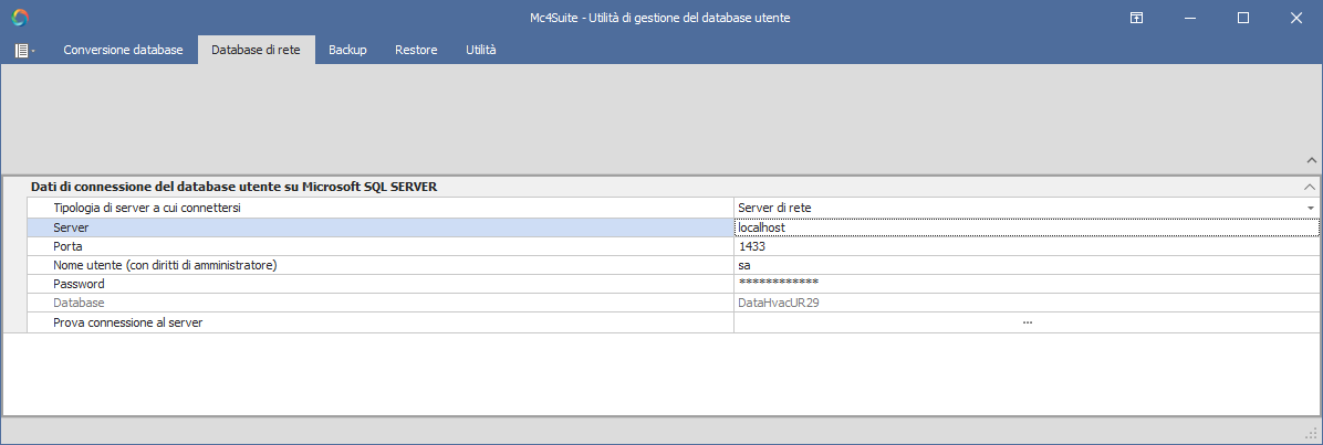In tale maschera è richiesta l'indicazione del : - Server: nome del pc della rete in cui risiede il database condiviso (in alternativa è possibile specificarne l'indirizzo IP); - Porta ; numero della porta TCP di comunicazione di SQLServer; il valore predefinito è 1433 - Nome utente : nome dell'utente registrato per l'accesso al database condiviso (il valore predefinito è sa) - Password : password registrata per l'accesso al database condiviso (il valore predefinito è Lfq3ygshdw>a)