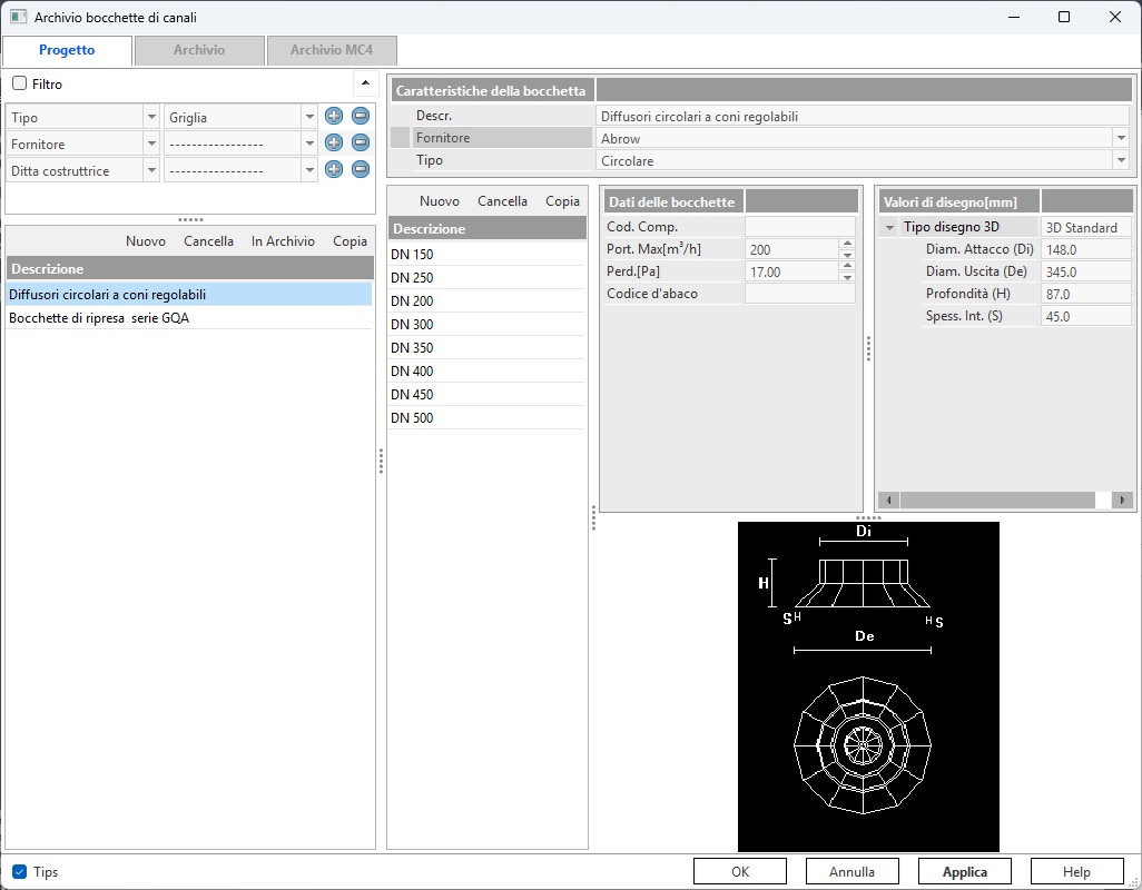 tipologie di bocchette più diffuse e dalla scheda Archivio