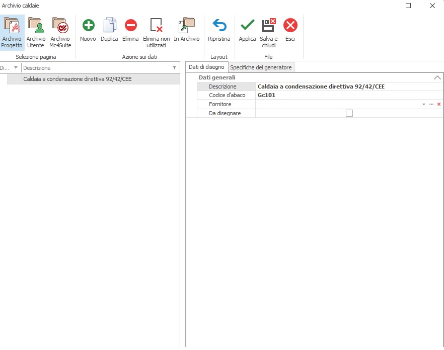 Caldaie si accede alla maschera di gestione del database delle