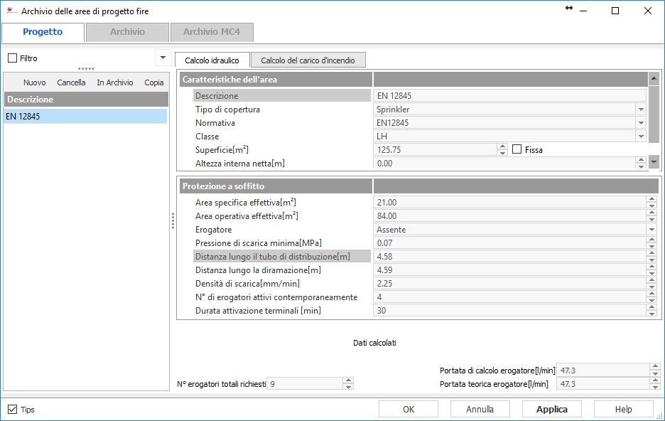 scelte: EN12845, oppure NFPA13. Se il Tipo di copertura è