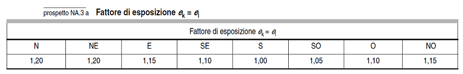 Fattore di correzione per l'esposizione : per le esposizioni di tipo "esterno" applicate a pareti verticali (inclinazione = 90 gradi), corrisponde al "Fattore di correzione per l'esposizione " ek, el previsto dall'allegato NA della UNI EN 12831, applicabile agli edifici direttamente soleggiati. I valori di default sono quelli previsti dal prospetto NA.3a della norma stessa; tali valori possono essere aumentati