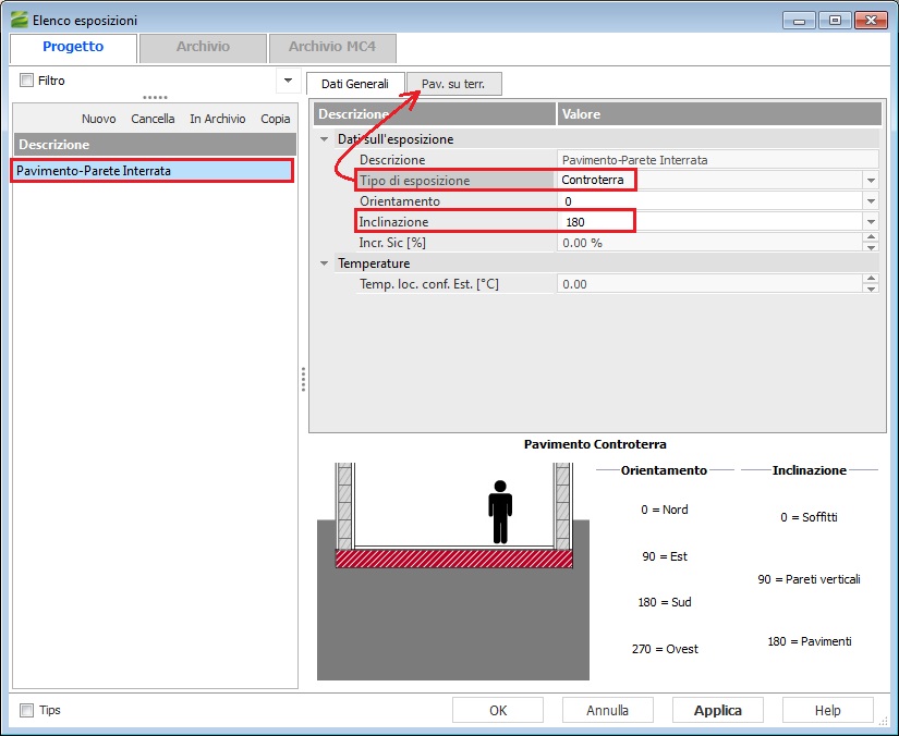 3) Digitare il valore 180 nel campo Inclinazione. Sebbene tale esposizione farà riferimento ad una parete per la quale si usa solitamente 90 come inclinazione, in questo caso deve essere usato 180 in modo che il programma mostri la scheda Pav. su Terra