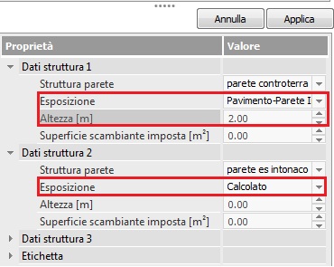 Qualora la parete non fosse completamente interrata l'esposizione deve essere associata solo parzialmente alla parete. Per fare questo occorre diversificare l'esposizione nei dati estesi della parete come mostrato nella figura sottostante.