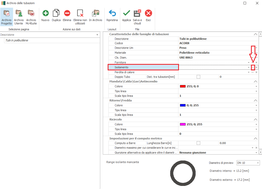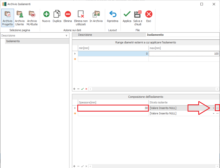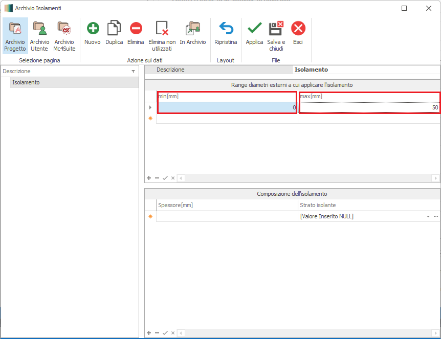 Quindi si dovrà definire il range di diametri cui applicare lo spessore di materiale isolante che verrà specificato nella finestra sottostante "Composizione dell'isolamento".