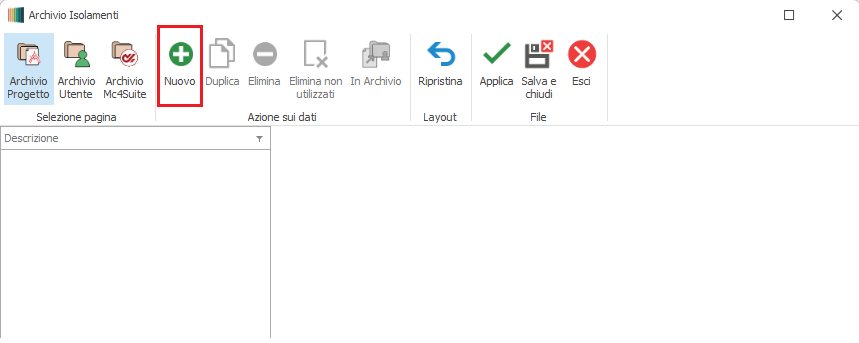Per creare un nuovo progetto di isolamento occorre cliccare sul pulsante Nuovo.