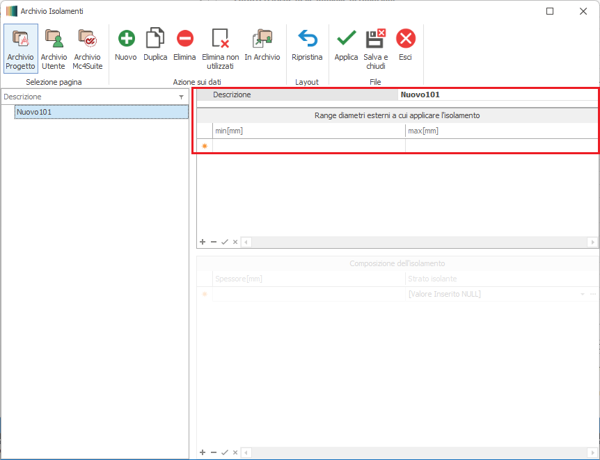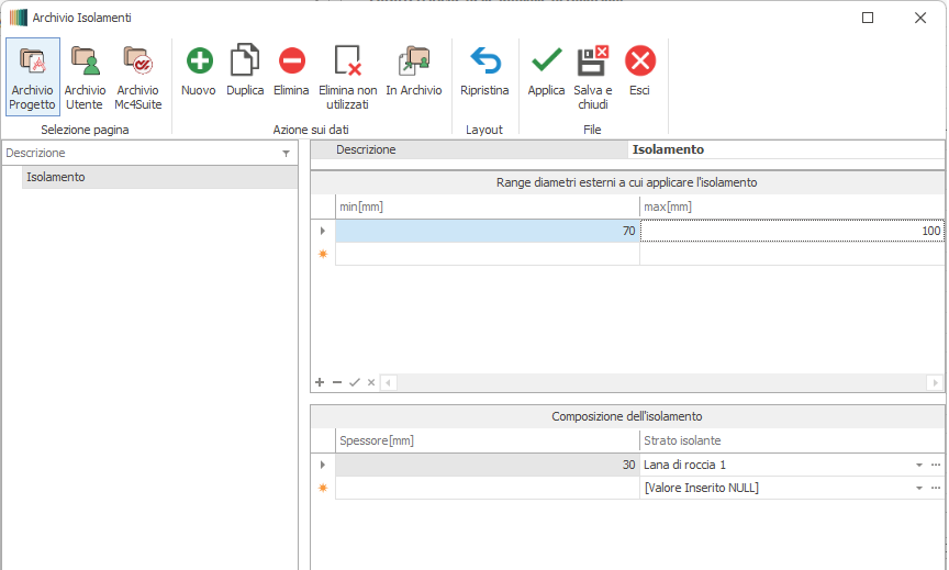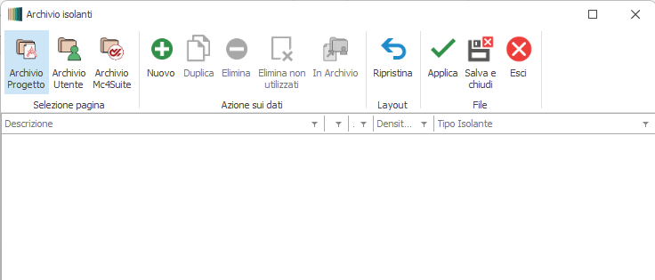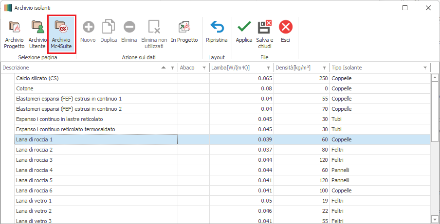 In tale archivio il materiale isolante può essere creato ex novo oppure caricato da Archivio Utente o da Archivio Mc4.