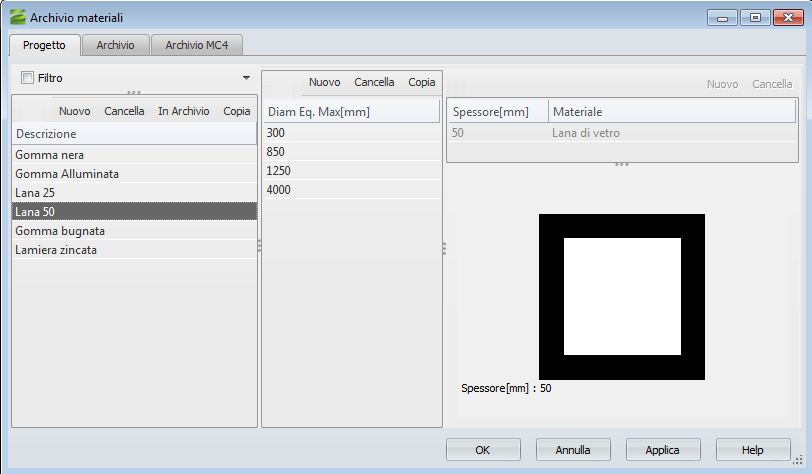 Per creare, modificare, salvare e cancellare elementi, leggi Come gestire gli archivi di Mc4Suite.