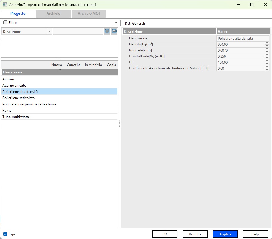in corrispondenza del campo Materiale ed il programma mostrerà