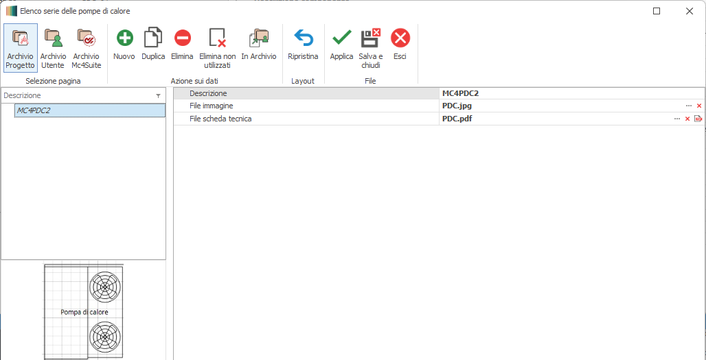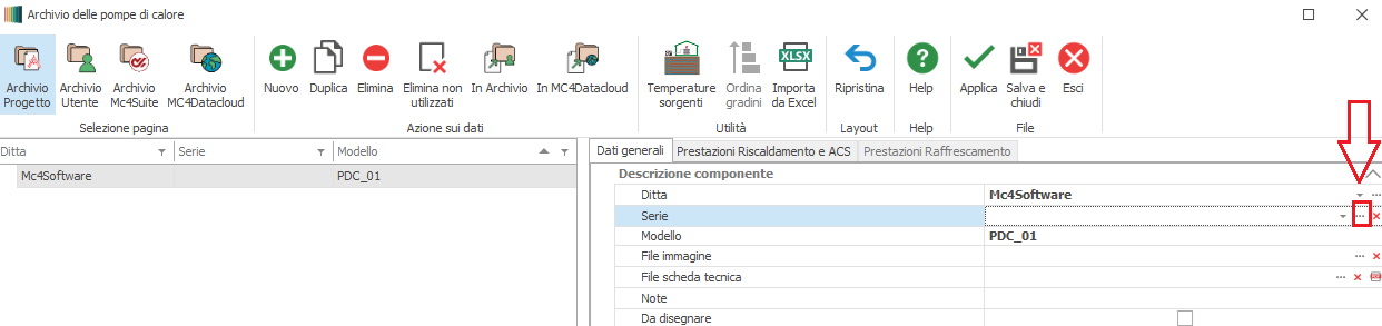 Modello : in tale campo si attribuisce la denominazione desiderata in luogo di quella provvisoria assegnata dal software. Se l'elemento è stato caricato dall' Archivio Mc4Datacloud, tale informazione viene riportata in automatico. File immagine : permette di associare un immagine dell'elemento da visualizzare all'interno dell'archivio. Per associare un immagine occorre cliccare sul primo dei due pulsanti posti nell'estremità destra .Per eliminare l'associazione occorre cliccare sul secondo pulsante (contrassegnato dal simbolo "x" di colore rosso. Se l'elemento è stato caricato dall' Archivio Mc4Datacloud, tale informazione viene riportata in automatico. File scheda tecnica : permette di associare un datasheet dell'elemento in formato PDF; per eseguire l'associazione occorre cliccare sul primo dei tre pulsanti posti nell'estremità destra. Per eliminare l'associazione occorre cliccare sul secondo pulsante (contrassegnato dal simbolo "x" di colore rosso), per visualizzare il documento occorre cliccare sull terzo pulsante. Se l'elemento è stato caricato dall' Archivio Mc4Datacloud, tale informazione viene riportata in automatico. Note : in tale campo è possibile inserire informazioni aggiuntive. Da disegnare:ponendo il segno di spunta in corrispondenza di tale campo si attiva un'apposita sezione in cui inserire i parametri dimensionali della pompa di calore ai fini del suo inserimento come elemento grafico DWG nell'ambito di una rete termica.( Dati di Disegno.)