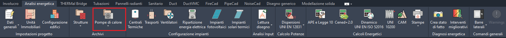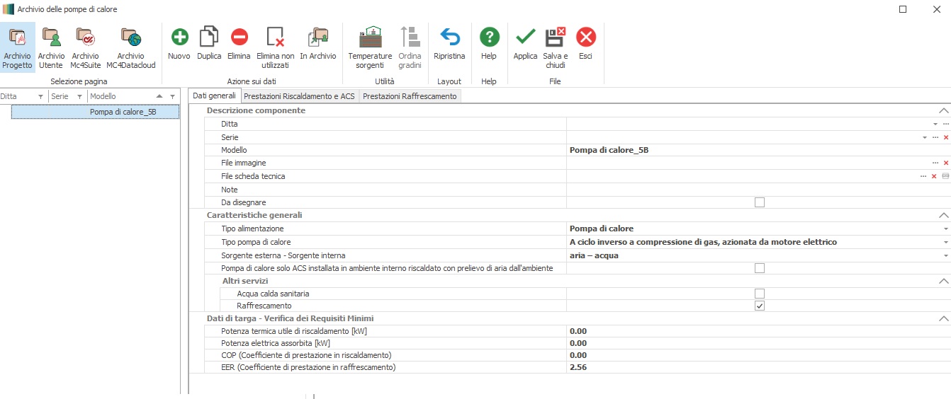 Raffrescamento : ponendo il segno di spunta in corrispondenza di tale campo, si identifica una pompa di calore che provvede anche a il servizio di raffrescamento; i relativi parametri di caratterizzazione si impostano nella scheda "Prestazioni Raffrescamento".