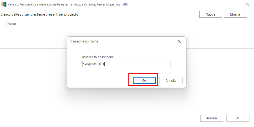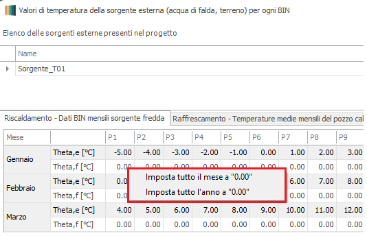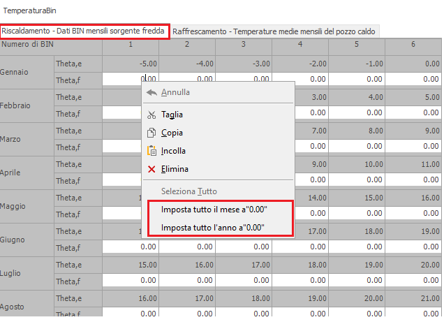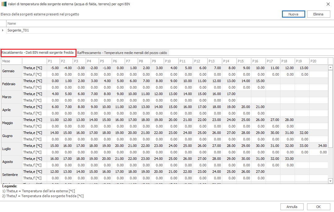 sezioni "Riscaldamento - Dati BIN mensili sorgente fredda"
