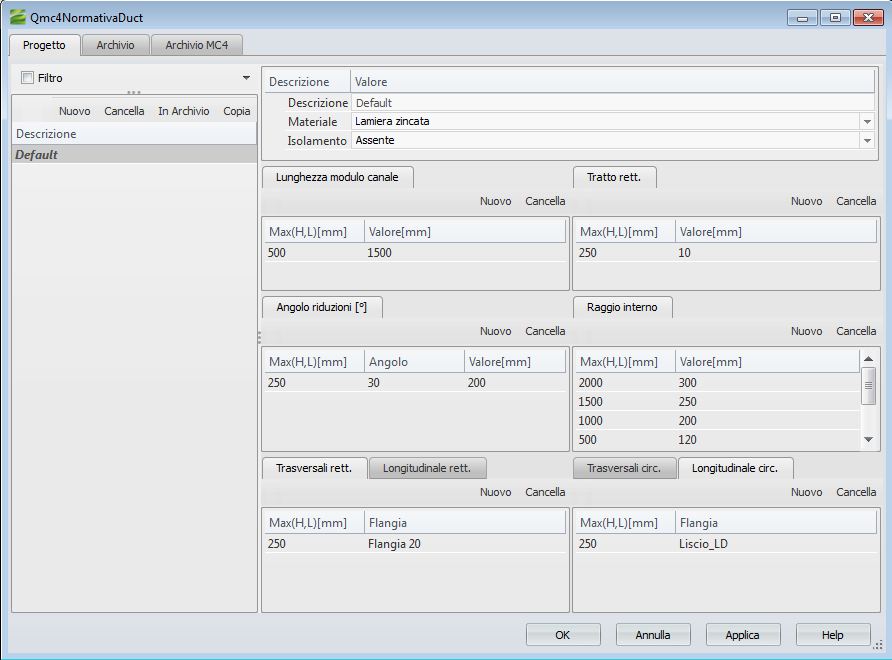 Per creare, modificare, salvare e cancellare elementi, leggi Come gestire gli archivi di Mc4Suite.