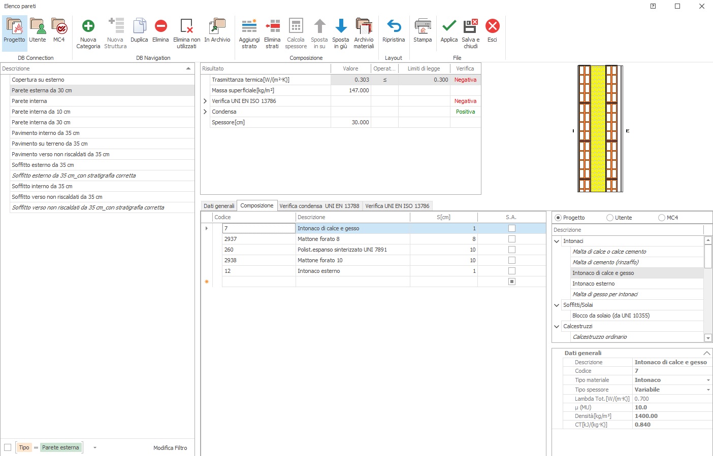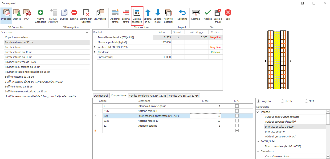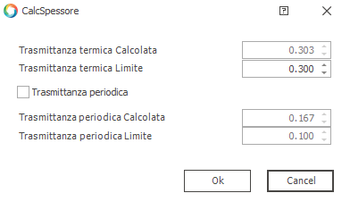 Selezionato un materiale isolante, cliccando sul tasto "Calcola spessore" posto nella barra superiore, si attiva la funzione automatica di conseguimento del valore della trasmittanza U e di trasmittanza termica periodica inferiore al valore limite previsto da normativa.