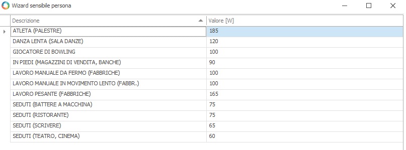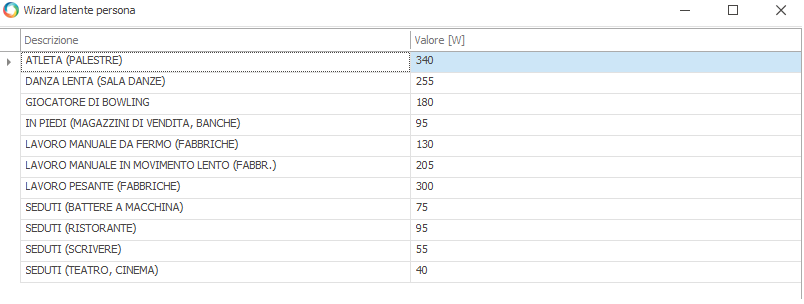 Persone – Latente [W] : Calore latente prodotto da ciascuna persona in funzione dell’attività fisica che svolge. Anche in questo caso selezionando tale campo, si attiva un pulsante premendo il quale si apre una finestra simile a quella sopra riportata dalla quale scegliere l’attività svolta e quindi l’apporto.