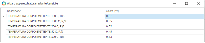 Persone – Indice di affollamento [m2/persona] : Indice di affollamento espresso in m2/persona. Il programma divide l’area di ciascun ambiente per questo valore ed approssima il risultato all’intero superiore. Persone - Profilo orario : Selezionare il profilo orario di presenza delle persone dal menu a tendina. Se l’archivio dei codici orario è vuoto, selezionare <Aggiungi in progetto> per aprire la maschera di gestione, crearne uno e selezionarlo (per approfondimenti vedi il par. Codici orari di funzionamento). Illuminazione – Fissa [w/m2] : Densità di illuminazione [w/m2] mantenuta in ambiente indipendentemente dall’apporto dovuto all’irraggiamento esterno attraverso i serramenti. Illuminazione – Variabile [w/m2] : Densità di illuminazione [w/m2] mantenuta in ambiente solo quando l’apporto dovuto all’irraggiamento esterno attraverso i serramenti risulta essere inferiore ad esso. Illuminazione – Tipo di illuminazione : Selezionare la tipologia di lampada tra le 4 opzioni possibili. Illuminazione - Profilo orario : Selezionare il profilo orario di presenza del carico dovuto all’illuminazione. Se l’archivio dei codici orario è vuoto, selezionare <Aggiungi in progetto> per aprire la maschera di gestione, crearne uno e selezionarlo (per approfondimenti vedi il par. Codici orari di funzionamento). Apparecchiature – Sensibile [w/m2] : Apporto di calore sensibile dovuto ad apparecchiature presenti nella zona e quindi negli ambienti, espresso in w/m2. Apparecchiature – Latente [w/m2] : Apporto di calore latente dovuto ad apparecchiature che emettono vapore, presenti nella zona e quindi negli ambienti, espresso in w/m2. Apparecchiature - Radiante/Sensibile [w/m2] : Rapporto tra la componente radiante e quella sensibile del carico dovuto all apparecchiature. Tale rapporto è funzione della temperatura del corpo emittente come si può vedere dalla maschera di selezione della stessa che si attiva premendo sul relativo pulsante e riportata qui di seguito. Valore normale è 0,45 corrispondente ad una temperatura del corpo emittente di 50°C.