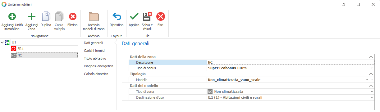 Una volta inserita una zona, in corrispondenza della voce Descrizione le si attribuirà, in luogo della denominazione alfanumerica provvisoria, la denominazione desiderata. Tipo di bonus: la voce è presente solo se nei "Dati progetto - Fabbisogno energetico" risulta selezionata l'opzione "Ecobonus 2020 (Superbonus)"; tale combobox permette di discriminare le zone che debbono essere considerate nell'ambito dell'APE Convenzionale ai fini dell'asseverazione dei requisiti per l'accesso agli incentivi fiscali del 110%.Presenta le tre opzioni: 1) Nessuno (diagnosi energetica senza incentivi) 2) Superecobonus 110 % 3) Esclusa da superbonus ed inclusa in ape In corrispondenza del campo Tipologia - Modello si assocerà il template per la zona in oggetto precedentemente creato in "Archivio modelli di zona". La sezione "Dati del modello" riepiloga, in sola lettura, le caratteristiche del modello associato alla zona.