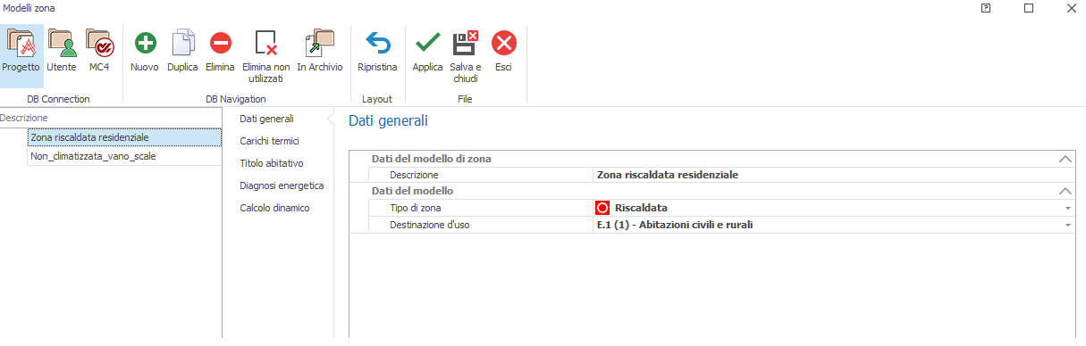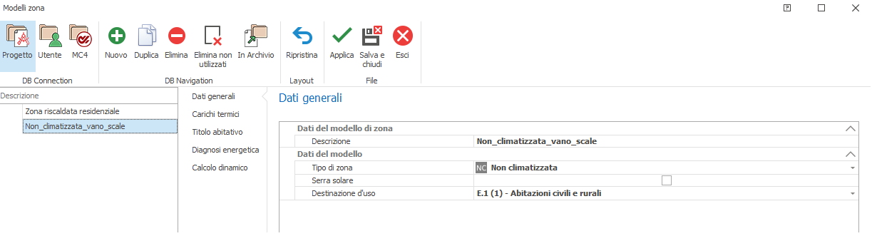 Descrizione : anche per il modello risulta necessario inserire una specifica denominazione, in luogo di quella alfanumerica provvisoria. Tipo di zona : occorre selezionare una delle seguenti opzioni: 1) Riscaldata opzione da adottare se si intende calcolare le dispersioni secondo UNI EN 12831 ed effettuare un calcolo energetico secondo UNI/TS 11300, sia in regime di riscaldamento che in regime di raffrescamento; 2) Climatizzata opzione da adottare se, oltre ai calcoli effettuabili con una zona di tipo Riscaldato, si intende effettuare anche la valutazione del carico termico invernale ed estivo secondo metodo ASHRAE. 3) Non climatizzata opzione da adottare per definire le zone (e quindi gli ambienti) non dotati di impianto di riscaldamento e raffrescamento