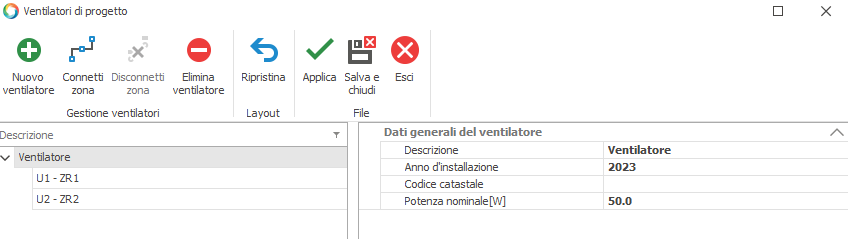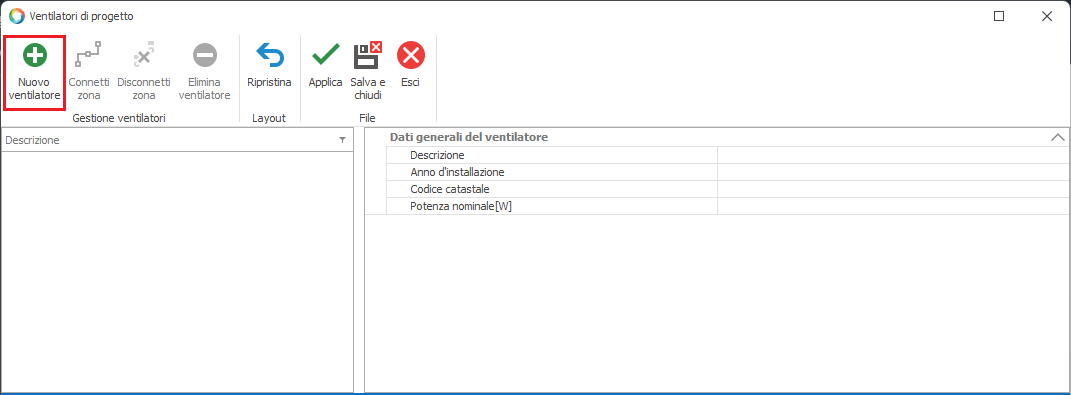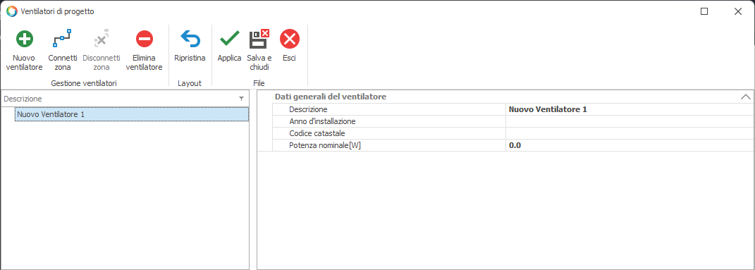 Per inserire un nuovo ventilatore si dovrà cliccare sulla voce contestuale "Nuovo ventilatore";