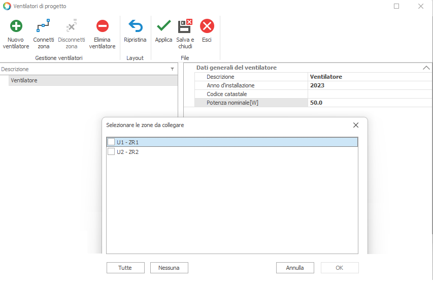 Definito il ventilatore si dovrà procedere all'assegnazione delle zone impiantistiche da esso servite; a tal fine occorre cliccare sul pulsante "Connetti zona" che attiverà il menu di selezione delle zone presenti in progetto.