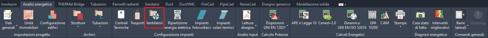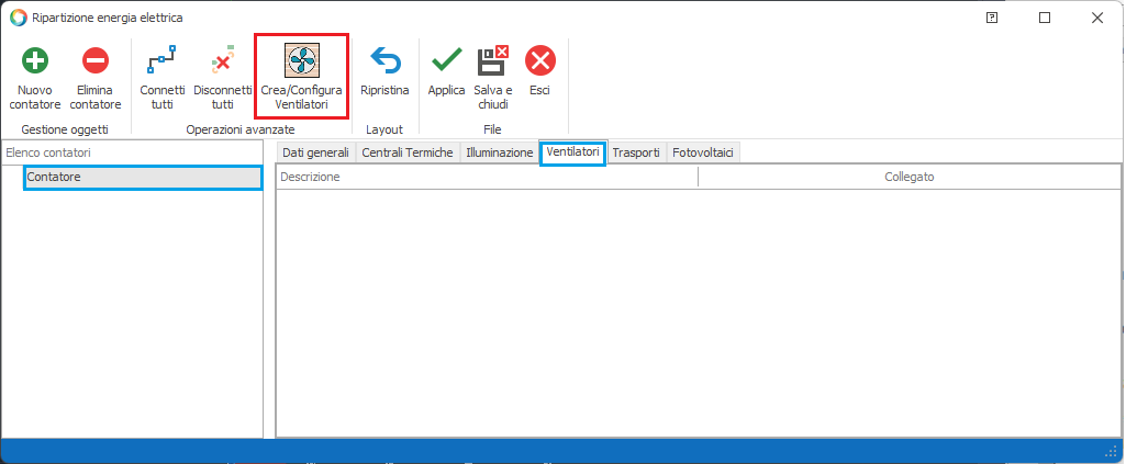 e quindi cliccando sul pulsante "Crea\Configura Ventilatori" disponibile una volta selezionata la scheda "Ventilatori" di un contatore elettrico.