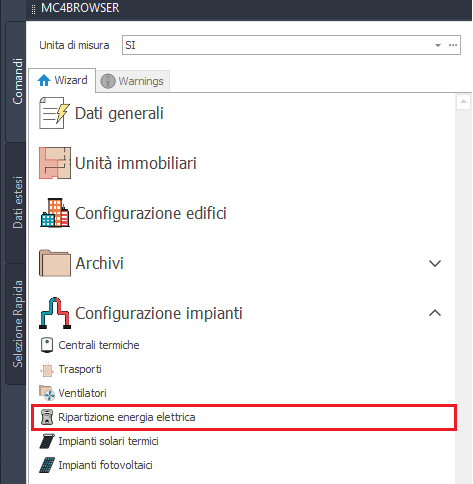 L'archivio "Ventilatori" è raggiungibile in due modalità differenti: - in maniera diretta, cliccando sul comando "Ventilatori" presente all'interno della lista degli archivi d'impianto all della barra dei comandi principale del software; - in maniera indiretta, accedendo preliminarmente al menu "Ripartizione energia elettrica" ubicato nella sezione "Edificio " della barra laterale "Mc4Browser"