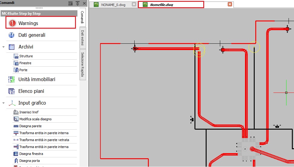 La figura sottostante mostra il pulsante Warnings attivo. Prestando attenzione alla parte grafica si possono notare altri warnings dovuti a cerchi gialli in corrispondenza di un oggetto canale ed un oggetto parete.