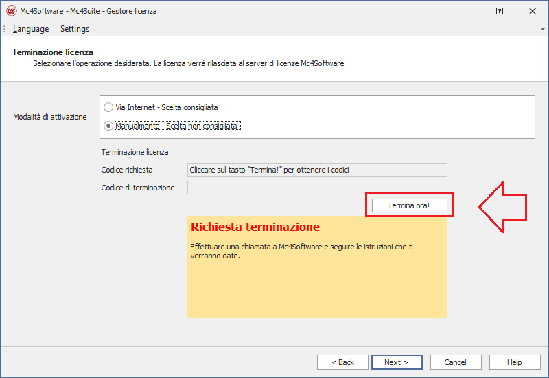 La modalità di terminazione manuale rappresenta un'alternativa adottabile nei casi in cui il pc destinato a gestire la licenza di rete : - non sia temporaneamente connesso alla rete internet, in seguito a disservizio tecnico da parte del fornitore dell'accesso alla rete (provider) - non possa strutturalmente connettersi a servers esterni in virtù dell'adozione di particolari policy di sicurezza. A differenza della procedura via internet, tale operazione per l'utente non è immediata nè totalmente autonoma in quanto necessita di interfacciarsi con il servizio di Supporto tecnico di Mc4Software.