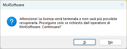 Comparirà una notifica che ricorda all'utente l'irreversibilità dell'operazione e la necessità di interfacciarsi con il supporto tecnico di Mc4Software.