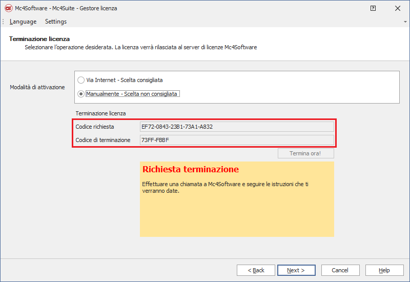 Risposto affermativamente alla richiesta di proseguire nell'operazione, nella sezione "Terminazione licenza" vengono mostrati: - il Codice richiesta, da comunicare all'operatore del servizio di supporto tecnico di Mc4Software - il Codice di terminazione, da comunicare all'operatore del servizio di supporto tecnico di Mc4Software. Ricevuta conferma della regolarità dei codici comunicati da parte dell'operatore di Mc4Software, si potrà cliccare sul pulsante NEXT per finalizzare l'operazione di terminazione.