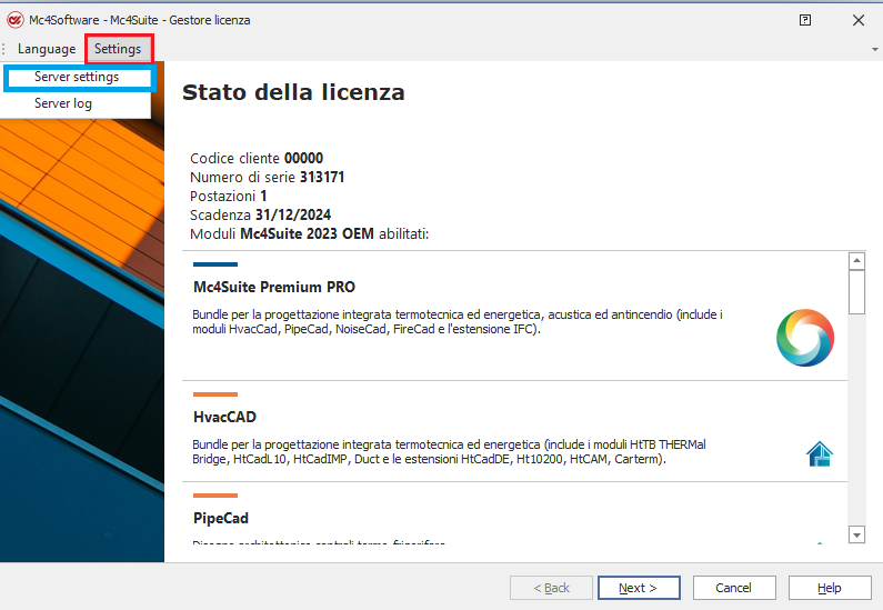 licenza di rete, il pulsante Settings consente attivare il
