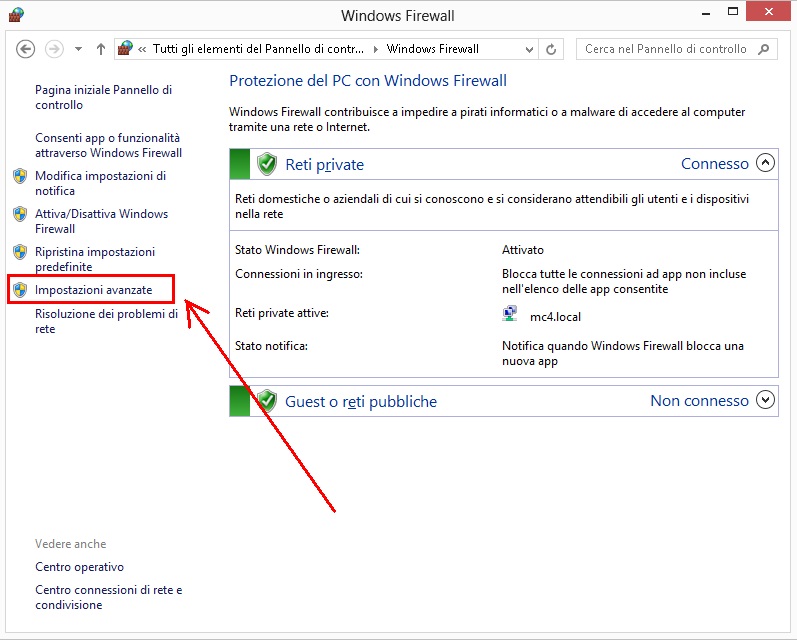 configurazione del Firewall di Windows, nella sezione di sinistra,