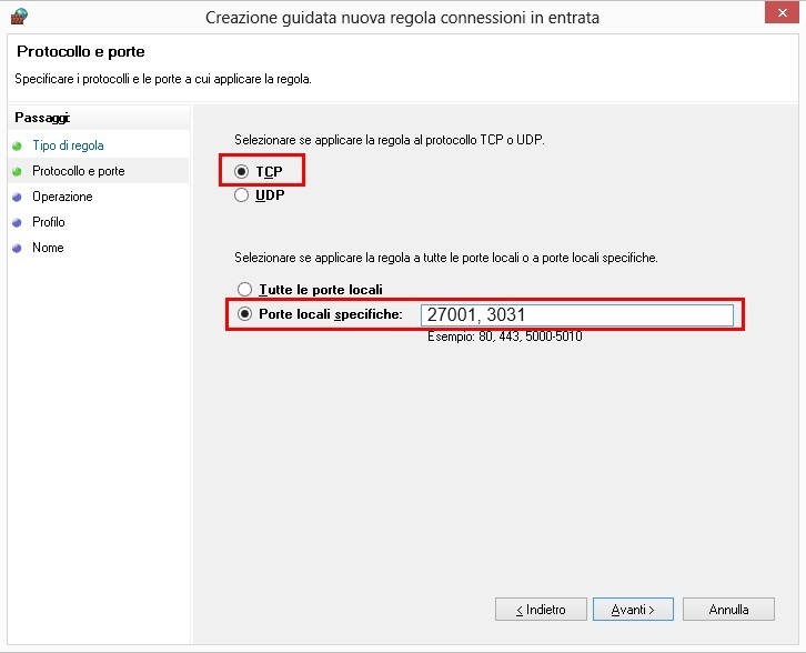 Apertura delle porte TCP 27001 e TCP 3031 all'interno del