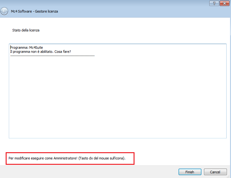 La prima schermata notifica il fatto che non è stata rilevata la presenza di alcuna licenza; per procedere all' attivazione del periodo di prova si cliccherà sul pulsante NEXT. Qualora il software non sia stato eseguito come amministratore la maschera non consentirà di procederà oltre ed inviterà l'utente ad eseguire il software come Amministratore; in tal caso occorre chiudere il gestore (tramite il pulsante FINISH), chiudere il programma e riavviarlo come amministratore (ovvero cliccando sull'icona del desktop con il tasto destro del mouse e scegliendo l'opzione "Esegui come amministratore") :