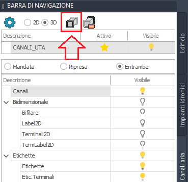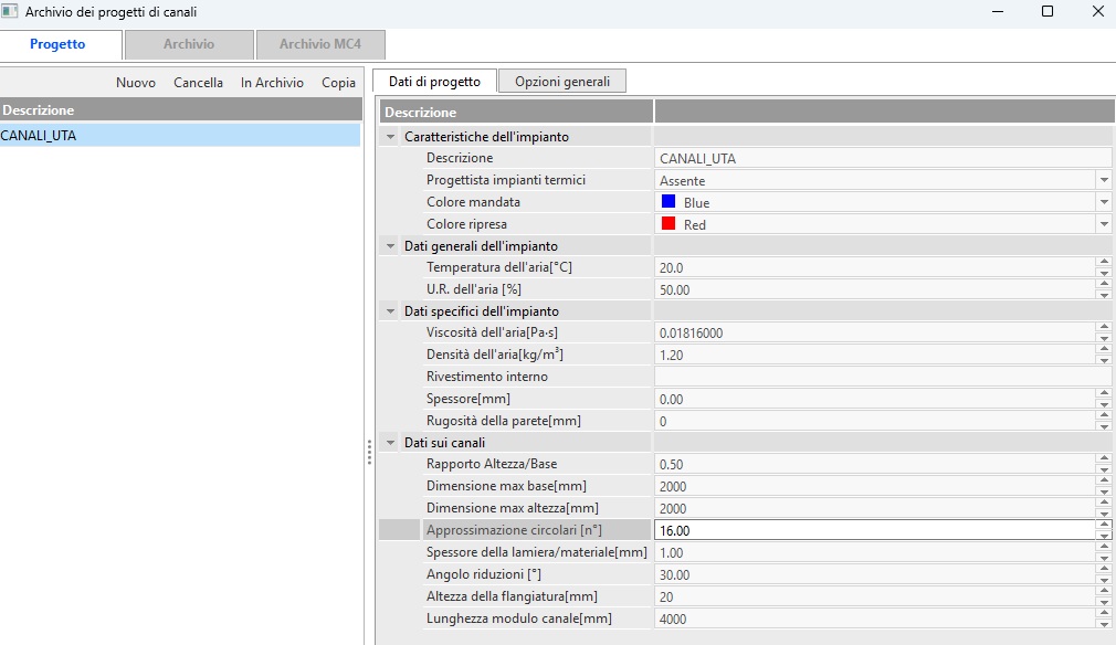 l’icona barra dei comandi. Esiste inoltre un'altra via per creare un nuovo progetto tubi: l'operazione si può eseguire a partire barra laterale di nome BARRA DI NAVIGAZIONE, selezionando il tab "CANALI" e cliccando sul pulsante evidenziato nell'immagine sottostante. . Appare, tra le varie opzioni, il bottone<NUOVO PROGETTO CANALI > la cui selezione porta direttamente alla maschera di creazione di un nuovo progetto di tubazioni. L' altra opzione possibile è <NUOVO PROGETTO CANALI VMC > che, come descritto dagli stessi nomi, porta alla finestra di creazione di un progetto canali DuctVMC In seguito ad una delle modalità sopra descritte, si apre la finestra seguente: La finestra ha la configurazione tipica di ogni archivio del programma per la descrizione della quale si rimanda all'apposita pagina. La creazione di un nuovo progetto di canali inizia alla selezione del bottone <NUOVO> posto nella sezione sinistra della maschera, successivamente alla quale é richiesta la definizione di una descrizione/nome del progetto stesso. N.B. In caso di più linee di mandata e di ripresa è necessario definire più progetti in quanto il programma effettuerà il calcolo e la stampa, sia del dimensionamento che del computo metrico, del solo progetto corrente. La conferma dei dati inseriti avviene cliccando sul bottone OK. Il nome dell'impianto appare in elenco nella colonna sinistra della maschera e selezionandolo é possibile utilizzare i vari comandi di gestione di progetto <CANCELLA>, <IN ARCHIVIO>, <COPIA> La finestra nella sua area destra si compone di 2 schede, ovvero : |